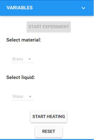 The user can repeat the experiment to change the material, liquid and temperature TH from the "Variables" section in the simulator.